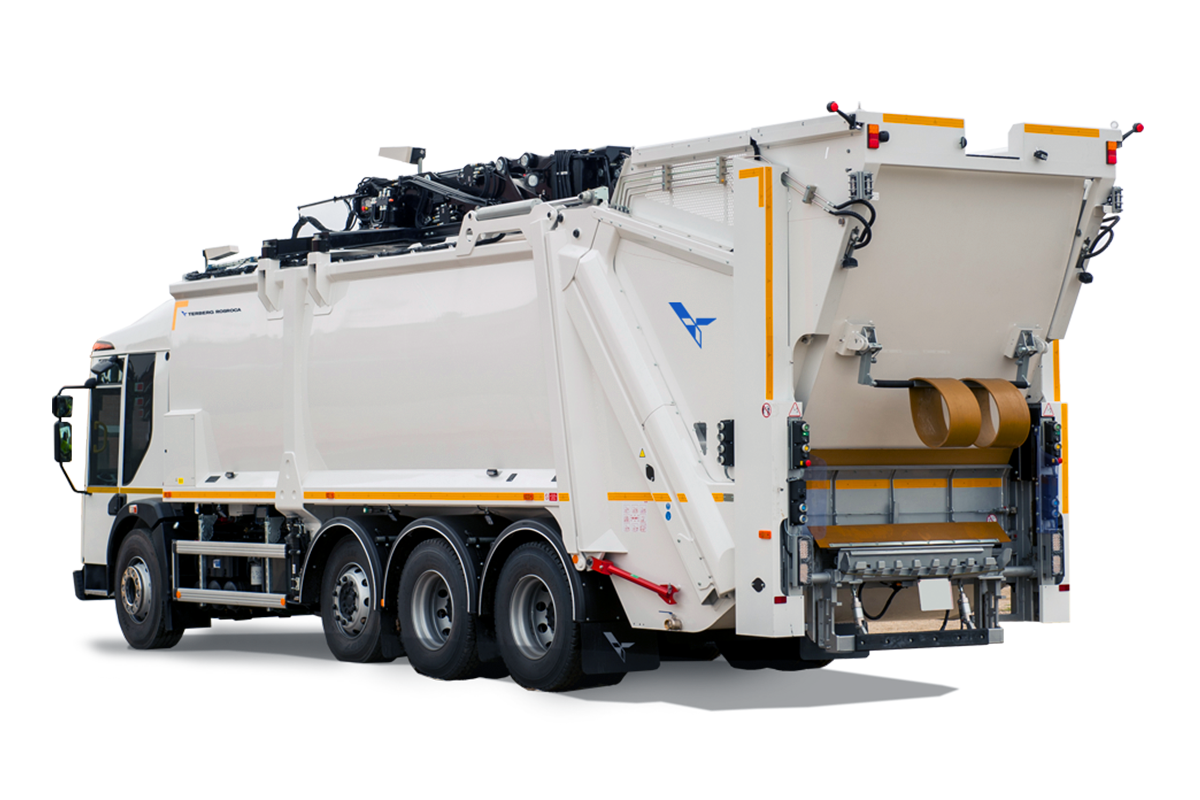 Szeroka zabudowa Olympus z tylną płytą wsypową i żurawiem do zbiórki odpadów z pojemników podziemnych